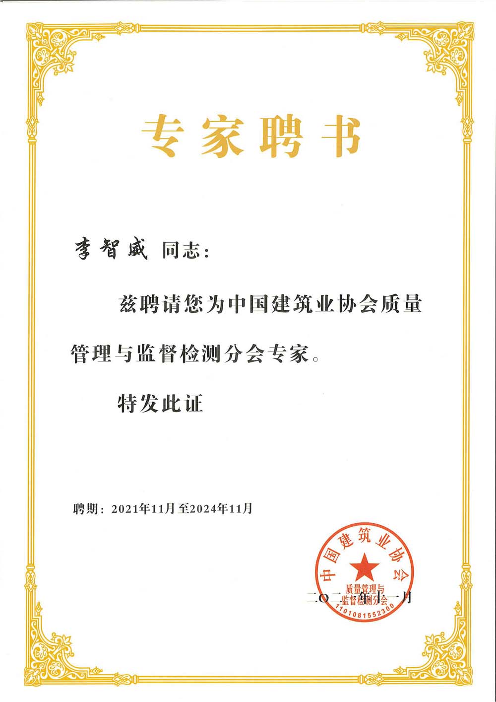 李智威被聘為中國建筑業(yè)協(xié)會(huì)質(zhì)量監(jiān)督檢測分會(huì)專家