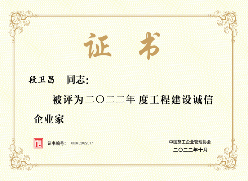 集團(tuán)董事長段衛(wèi)昌榮獲二O二二年度工程建設(shè)誠信企業(yè)家稱號
