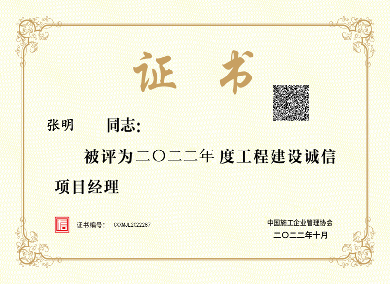 集團(tuán)公司項(xiàng)目經(jīng)理張明榮獲二O二二年度工程建設(shè)誠信項(xiàng)目經(jīng)理稱號