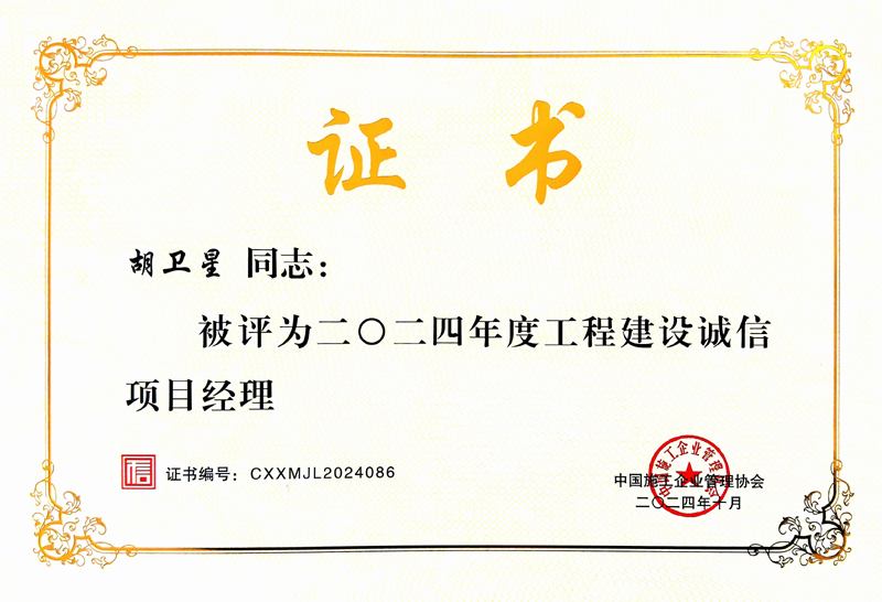 集團(tuán)公司項(xiàng)目經(jīng)理胡衛(wèi)星獲評二○二四年度工程建設(shè)誠信項(xiàng)目經(jīng)理榮譽(yù)稱號