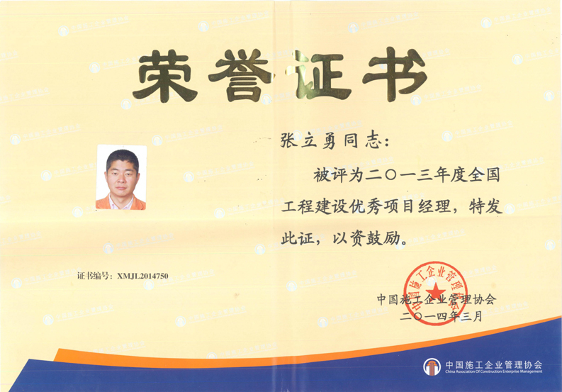 2013年度全國(guó)工程建設(shè)優(yōu)秀項(xiàng)目經(jīng)理(張立勇)