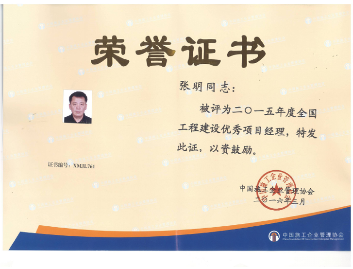 2016年度全國(guó)工程建設(shè)優(yōu)秀項(xiàng)目經(jīng)理(張明)