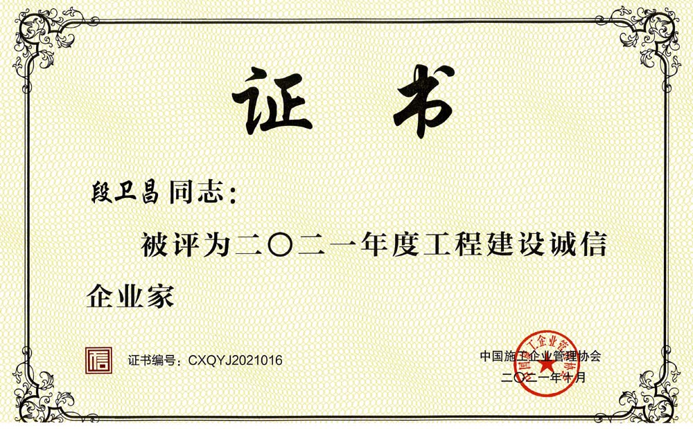 段衛(wèi)昌榮獲2021年度工程建設(shè)誠(chéng)信企業(yè)家稱號(hào)