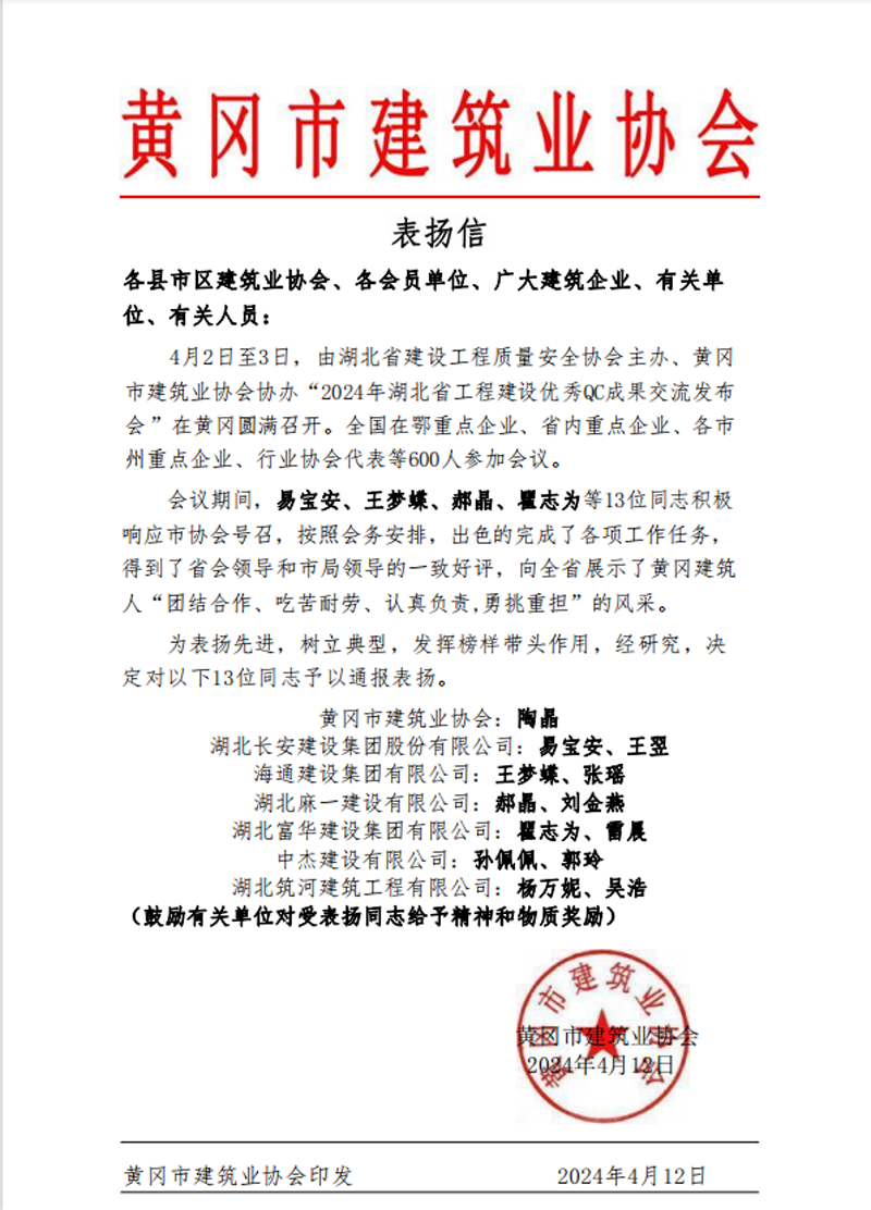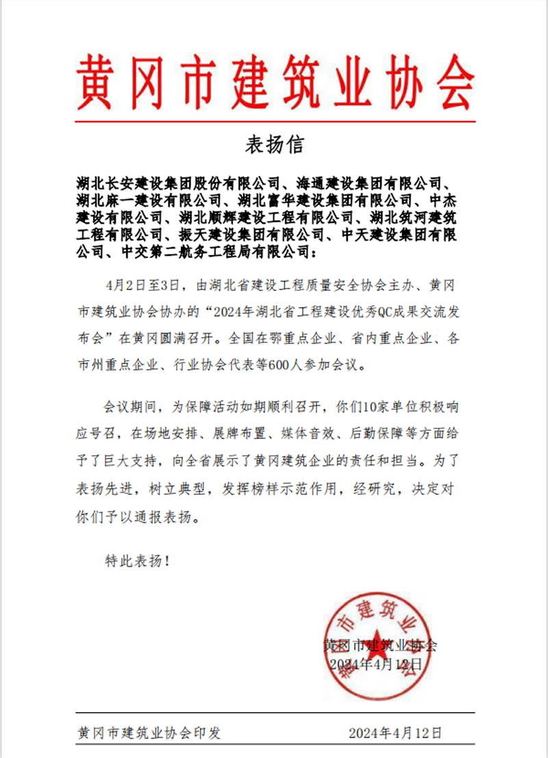 2024年湖北省工程建設(shè)優(yōu)秀QC成果交流發(fā)布會圓滿落幕--省建設(shè)工程質(zhì)量安全協(xié)會、黃岡市建筑業(yè)協(xié)會致集團(tuán)公司及個(gè)人的表揚(yáng)信