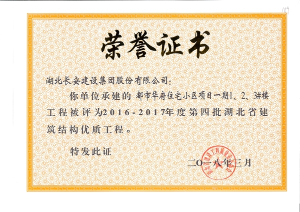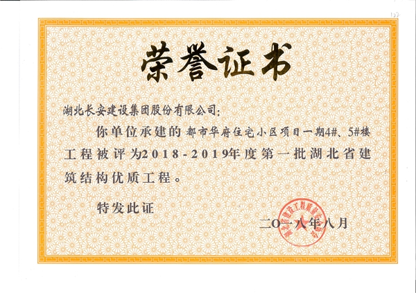 都市華府住宅小區(qū)項目一期(4#、5#)樓工程被評為2018-2019年度第一批湖北省建筑結構優(yōu)質工程