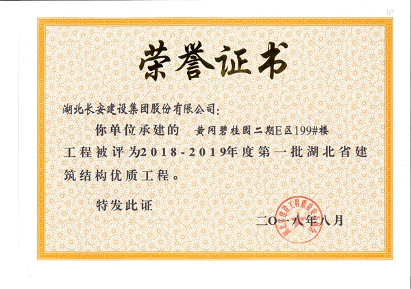 黃岡碧桂園二期E區(qū)199#樓工程被評為2018-2019年度第一批湖北省建筑結構優(yōu)質工程