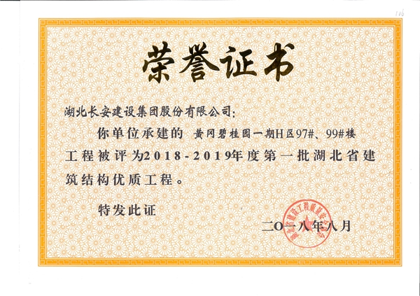 黃岡碧桂園一期H區(qū)(97#、99#)樓工程被評為2018-2019年度第一批湖北省建筑結構優(yōu)質工程