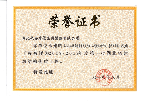 英山縣人民醫(yī)院整體遷建項目三期(放化療中心、藥科制劑樓、康復樓)工程被評為2018-2019年度第一批湖北省建筑結構優(yōu)質工程