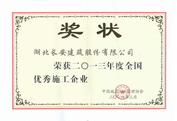2013年度全國(guó)優(yōu)秀施工企業(yè)證書