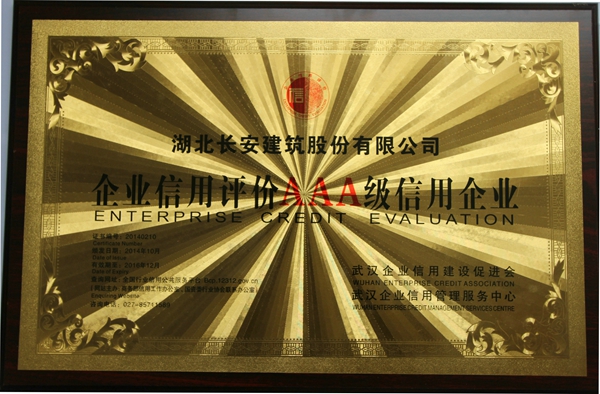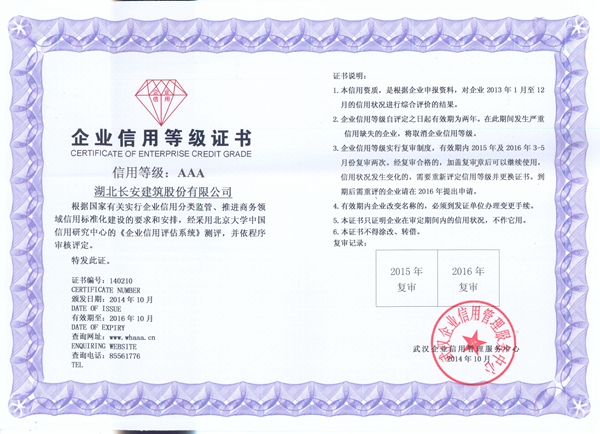 企業(yè)信用等級(jí)證書AAA武漢企業(yè)信用管理2014年10月至2016年10月