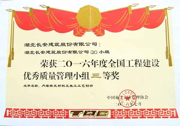 公司及QC小組榮獲2016年度全國(guó)工程建設(shè)優(yōu)秀質(zhì)量管理小組三等獎(jiǎng)(內(nèi)墻抹灰材料及施工工藝創(chuàng)新)