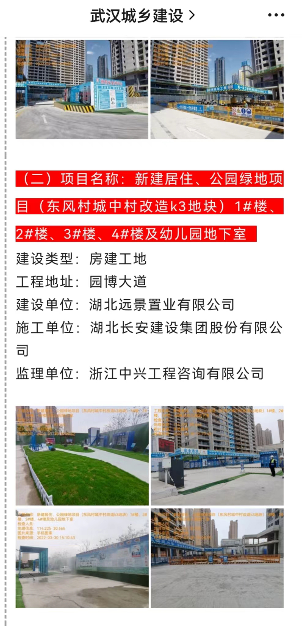 此前的3月29日,湖北省綠色建造科技創(chuàng)新聯(lián)合體觀摩交流會(huì)在K3項(xiàng)目召開。最近,在武漢市城鄉(xiāng)建設(shè)專班巡查整頓活動(dòng)中,認(rèn)定K3項(xiàng)目為“文明施工較好工地”,得到通報(bào)表?yè)P(yáng)。在2021年,H5地塊項(xiàng)目被評(píng)為武漢市10月份文明施工流動(dòng)紅旗建設(shè)工地。