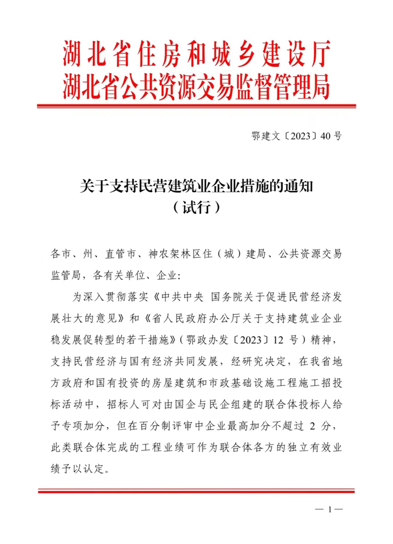 湖北省住房和城鄉(xiāng)建設廳、湖北省公共資源交易監(jiān)督管理局 關于支持民營建筑業(yè)企業(yè)措施的通知(試行)
