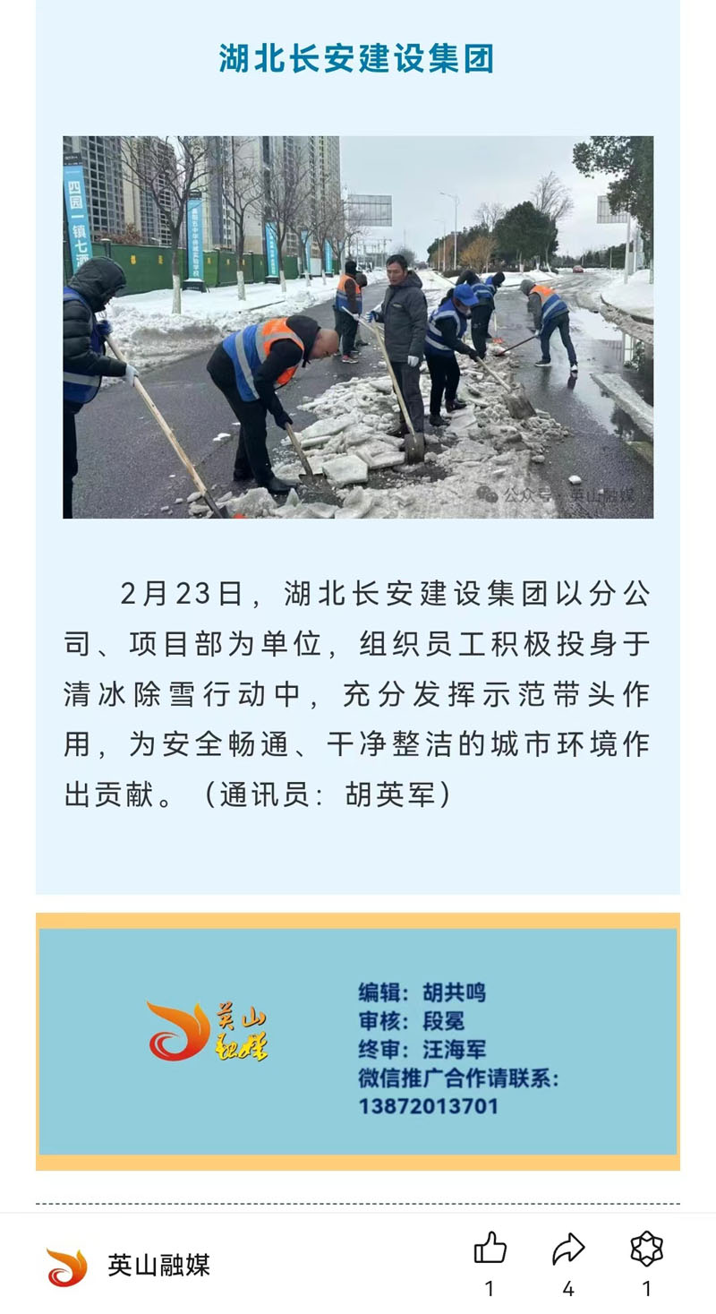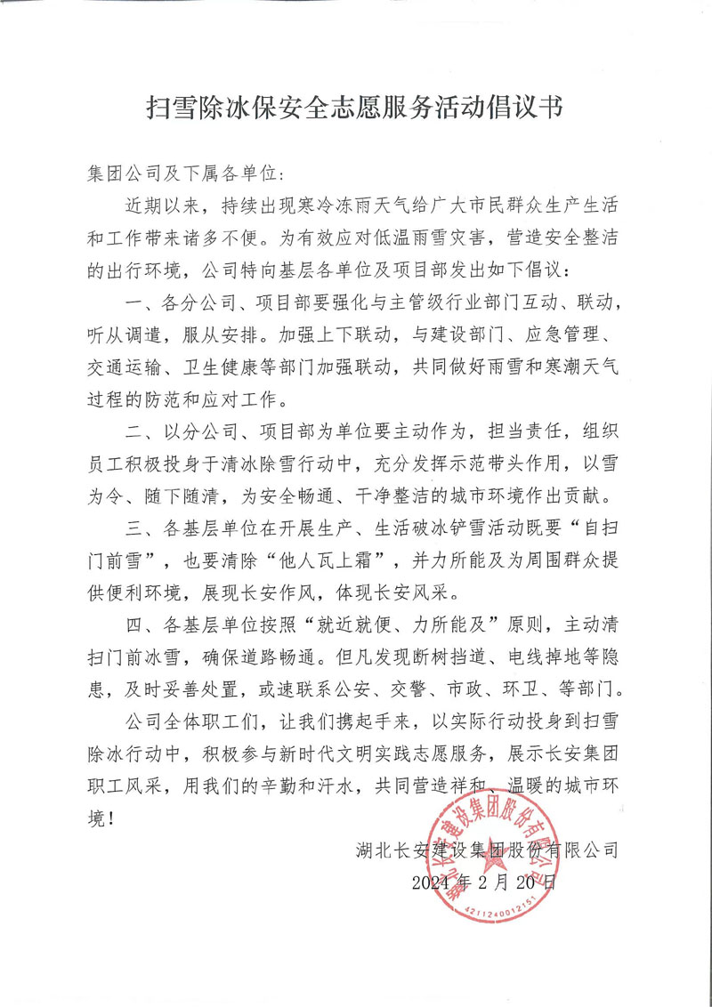 2月20日下午,湖北長安建設(shè)集團(tuán)向下屬各公司發(fā)布《掃雪除冰保安全志愿服務(wù)活動(dòng)倡議書》,倡議各分公司、項(xiàng)目部強(qiáng)化與主管級(jí)行業(yè)部門互動(dòng)、聯(lián)動(dòng)聽從調(diào)遣,服從安排。加強(qiáng)上下聯(lián)動(dòng),與建設(shè)部門、應(yīng)急管理交通運(yùn)輸、衛(wèi)生健康等部門加強(qiáng)聯(lián)動(dòng),共同做好雨雪和寒潮天氣過程的防范和應(yīng)對工作。要求以分公司、項(xiàng)目部為單位,主動(dòng)作為,組織員工積極投身于清冰除雪行動(dòng)中,為安全暢通、干凈整潔的城市環(huán)境作出貢獻(xiàn)。