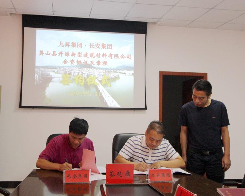 2019年9月12日上午,湖北長安建設(shè)集團(tuán)與九昇集團(tuán)(英山縣城投公司)合作成立英山縣開源新型建筑材料有限公司成功簽約。