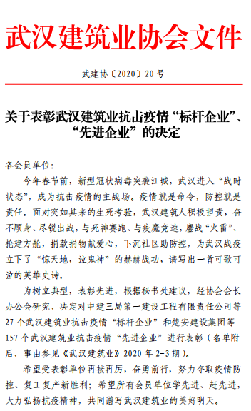集團(tuán)公司被武漢建筑業(yè)協(xié)會評為抗擊疫情“先進(jìn)企業(yè)”