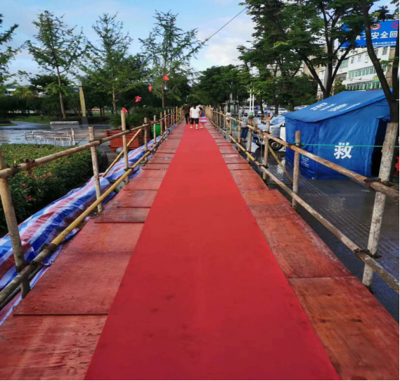 當晚21:30,高一米、寬約兩米、總長約1000米、橋面鋪設溫馨紅地毯的“防洪橋”,宛如一條長龍,靜臥于夜色中。有效避免洪水倒灌,確保學生不涉水,為7月7日—8日高考生順利出入考場提供便利。此舉引起強烈反響,大量英山群眾、英山外出務工人員、學生家長紛紛點贊,長安建設集團勇于擔當?shù)拇髳坌袨閺V受好評。